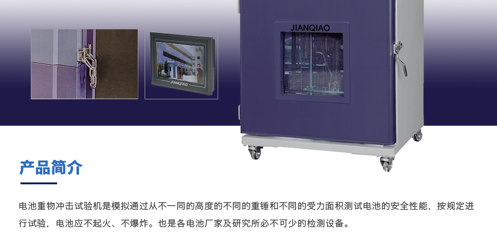 產品型號:JQ-8116(定制款) 品牌:劍 喬 用途:電池重物沖擊試驗機是模擬通過從不一同的高度的不同的重錘和不同的受力面積測試電池的安全性能,按規定進行試驗,電池應不起火、不爆炸。也是各電池廠家及研究所必不可少的檢咨詢熱線:13829135130